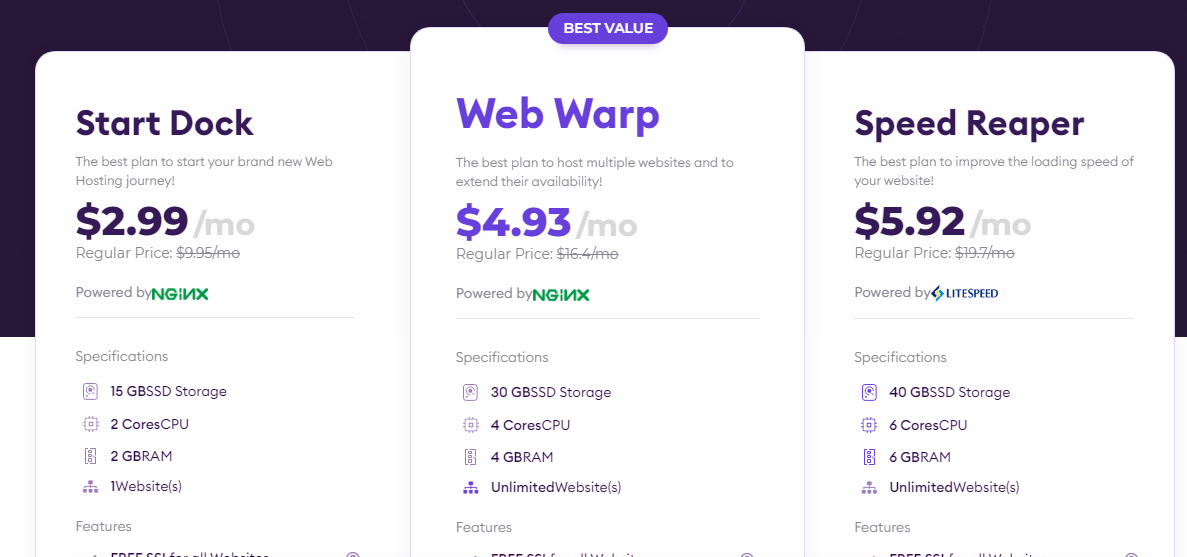 | Web Warp | $4.49/month | 30GB SSD | 4 cores | 4GB | Unmetered |