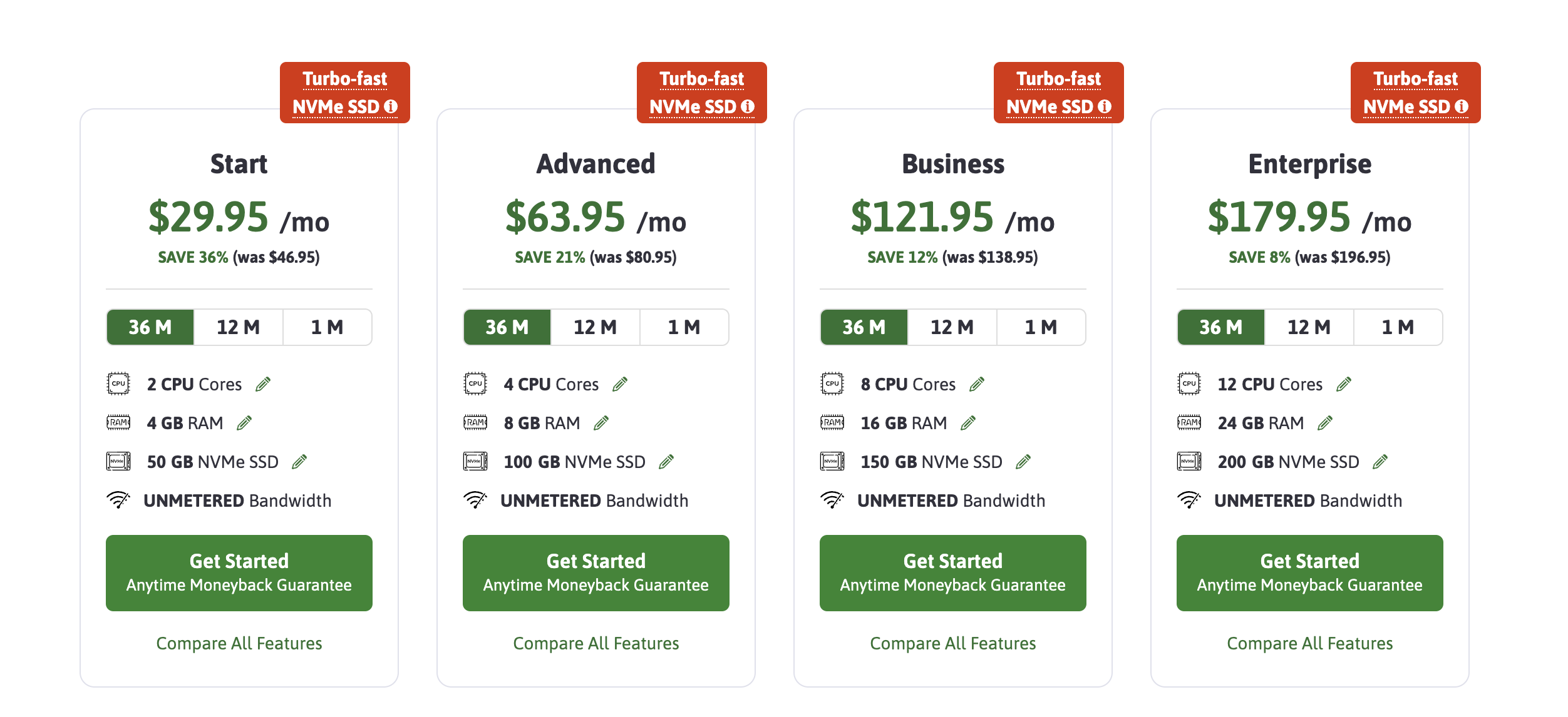 ✅ Start (Starts at $29.95 per month): This will include unmetered bandwidth, 50GB SSD, 4GB RAM, and 2 Core CPUs.